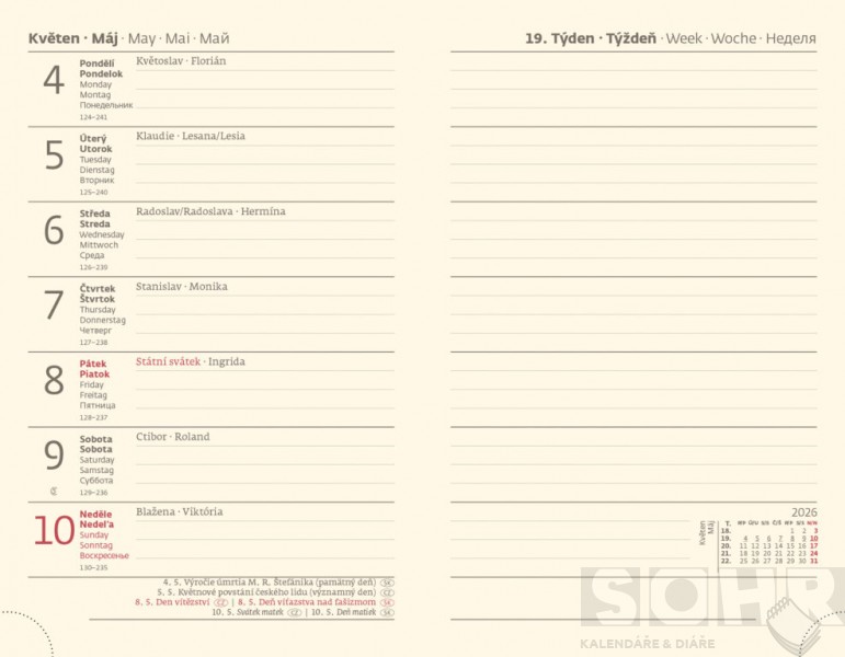 Formát diáře: 90 x 140 mm Rozsah diáře: 128 stran Kalendárium: týdenní kapesní + poutko na tužku + papír bloku chamois