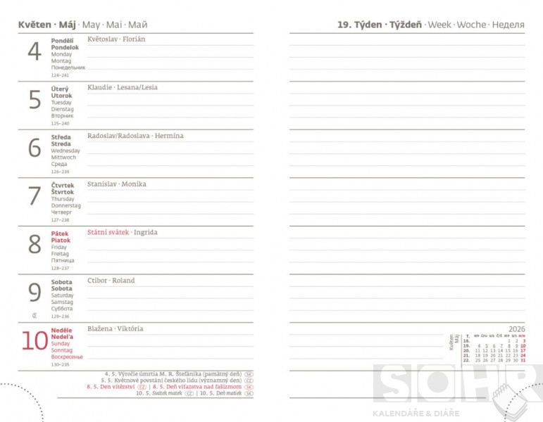 Formát diáře: 90 x 140 mm Rozsah diáře: 128 stran Kalendárium: týdenní kapesní